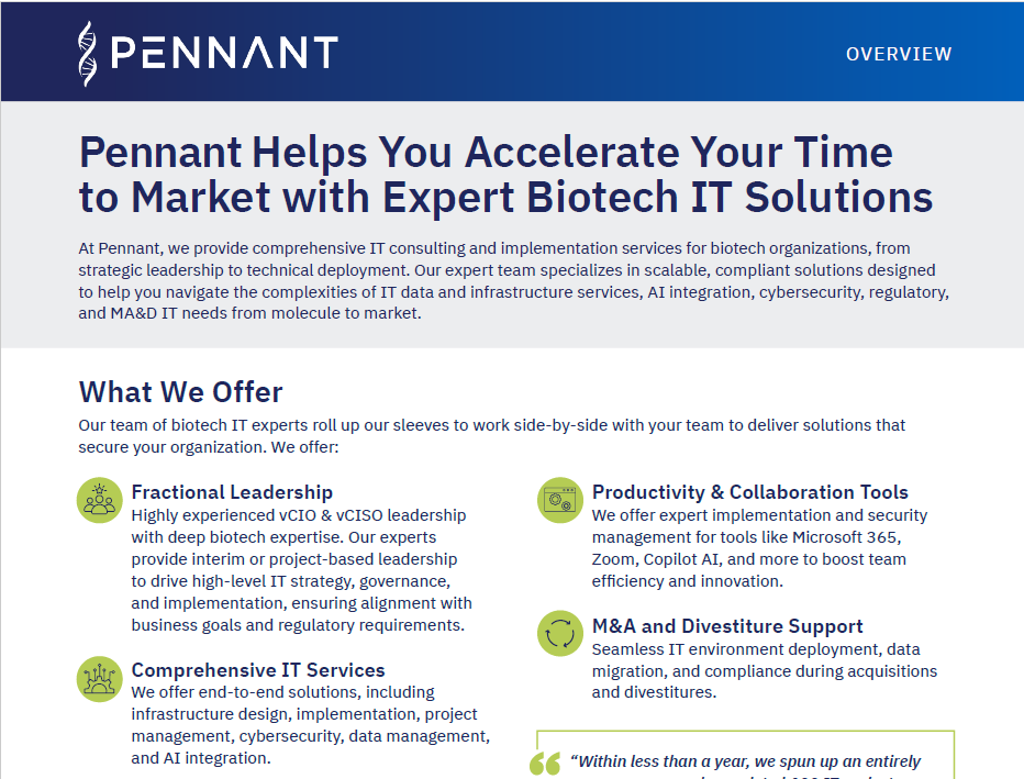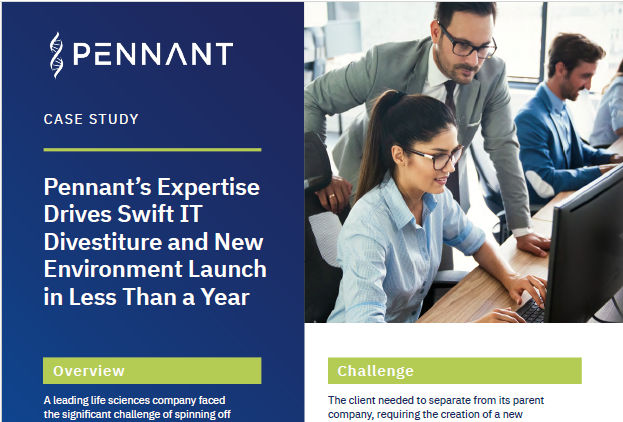 Discover how a leading life sciences company successfully launched a new organization and completed 100+ IT projects in under a year, with expert support from Pennant. Download the case study to see how Pennant’s biotech IT expertise and hands-on divestiture support streamlined complex data separation and infrastructure setup.